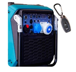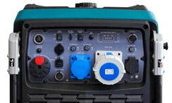 Панель управления: интуитивно простая, доступна неопытному пользователю. На нее выведены кнопка запуска генератора, розетки - 1 шт на 16 ампер, 1 шт на 32 ампера и 1 шт на 63 ампера, клеммы на 12В для зарядки аккумуляторов, предохранитель на розетки, заземление.
